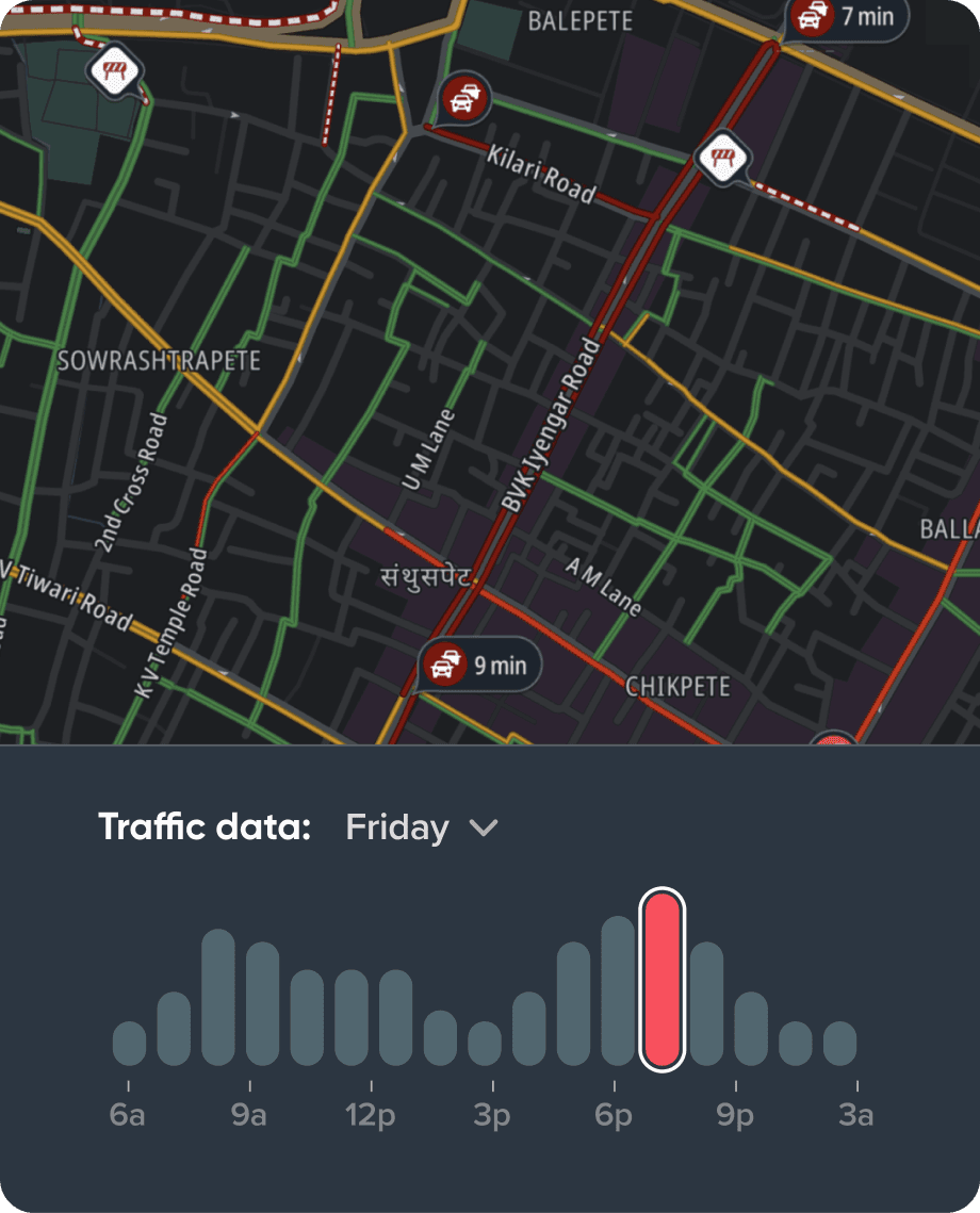 Solution: I introduced traffic layer simulations, allowing to preview map styles under representative conditions. Instead of waiting for live data spikes, designers could access simulated traffic density based on historical data and validate visual hierarchy, between smooth traffic and busy hours.