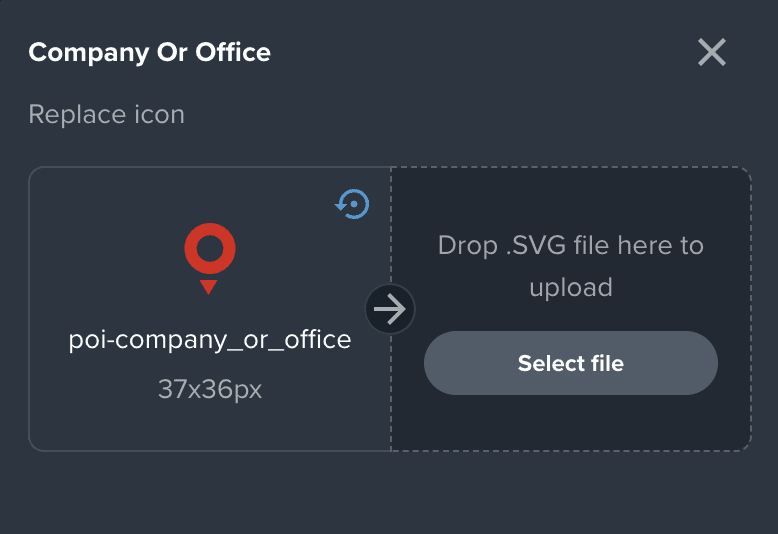 This removes friction between in map implementation. Under the hood, replacement is also systematic: default icons can be replaced by uploading SVGs named after the icon ID, with batch upload support. Alternatively, one icon at a time flow is still at user's disposal.