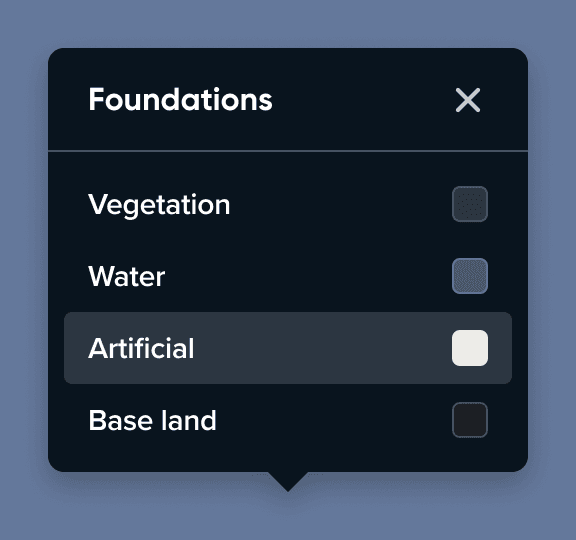Solution: context-aware tooltip when clicking anywhere on the map. Instead of exposing raw data, it shows relevant active module content. Clicking a road highlights road-related controls, clicking on water bodies — foundation settings, showing what you both can and can't see.