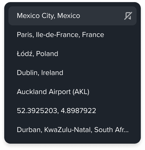 Map styling is a spatial task, and productivity comes down to how quickly you can connect what you see to what you can control. Scrolling and panning around a map canvas is wasted time during styling. I introduced a Map a Search feature that jumps directly to a city, address, or GPS coordinates (latitude, longitude) and ability to pin saved locations to access them later. This made styling sessions feel more like working in a modern map product.