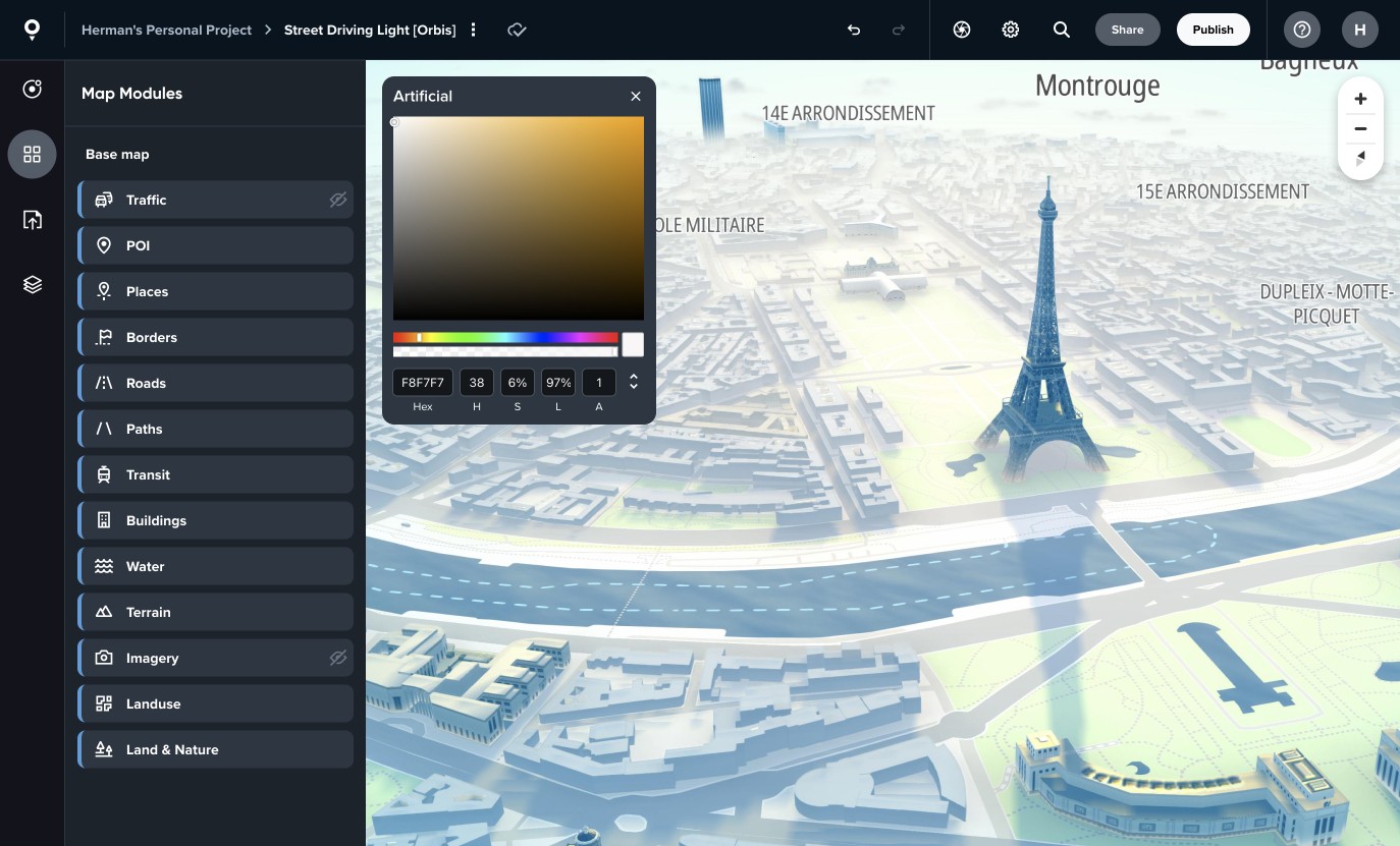 TomTom MapMaker is a cloud-based map styling web application that lets teams design, test, and publish custom map styles without writing code. It’s a tool that supports collaboration between GIS (Geographic Information System) designers and OEM (Original Equipment Manufacturers, car makers) engineers by making map customization more accessible. It is achieved through branding POI (Points of Interest), separate draft environment to test and production to ship, ease of navigation through search, map inspection, traffic simulation, and inclusive accessibility features.