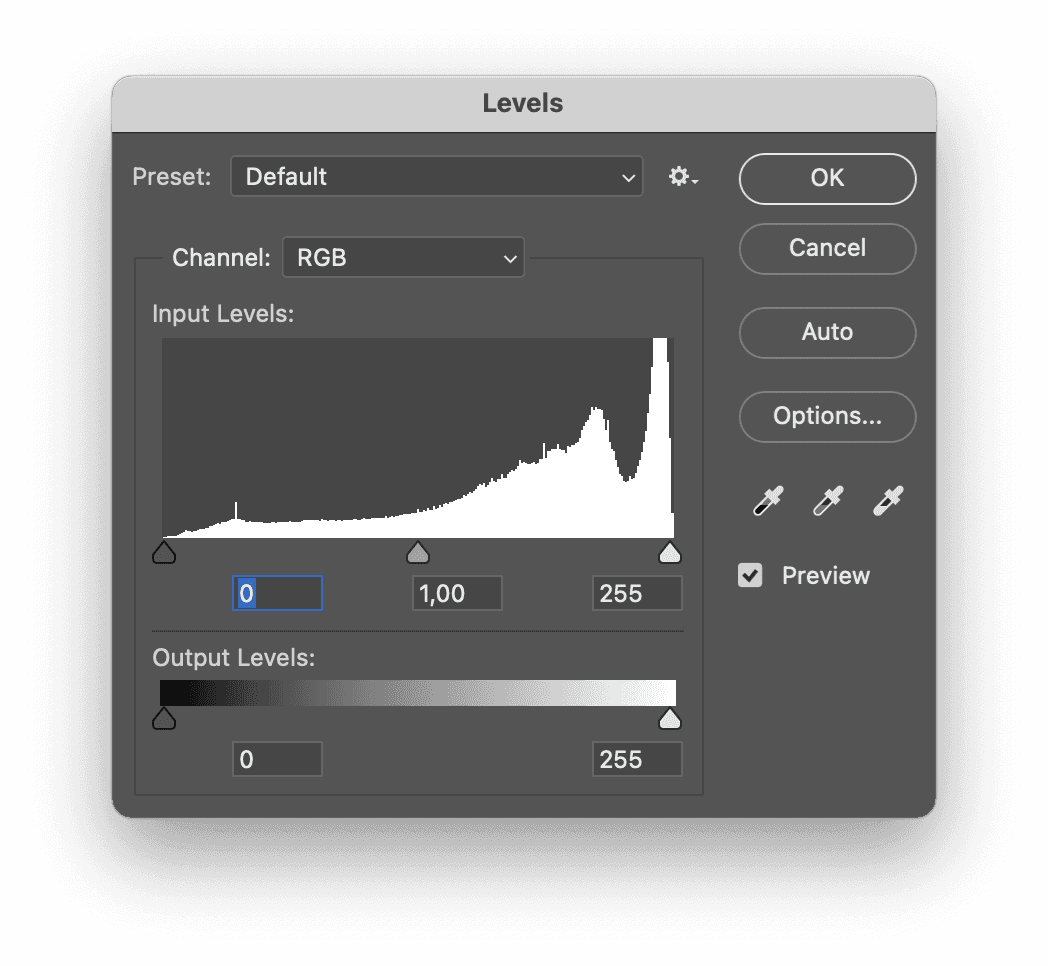 Original implementation of this control was the same as "levels" in Adobe Photoshop — a horizontal histogram. My interviewees found it frustrating, they were not sure how to use it.